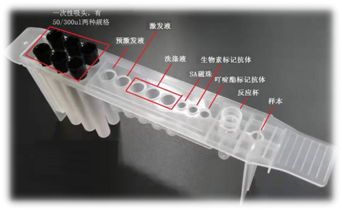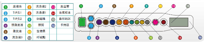 该类试剂采用试剂船设计。每个试剂即为一个试剂船,每个船包含血样处理、各类耗材、各类试剂组分,无需外接水和外排废弃物处理要求,实现ICU等特殊科室自检需求。